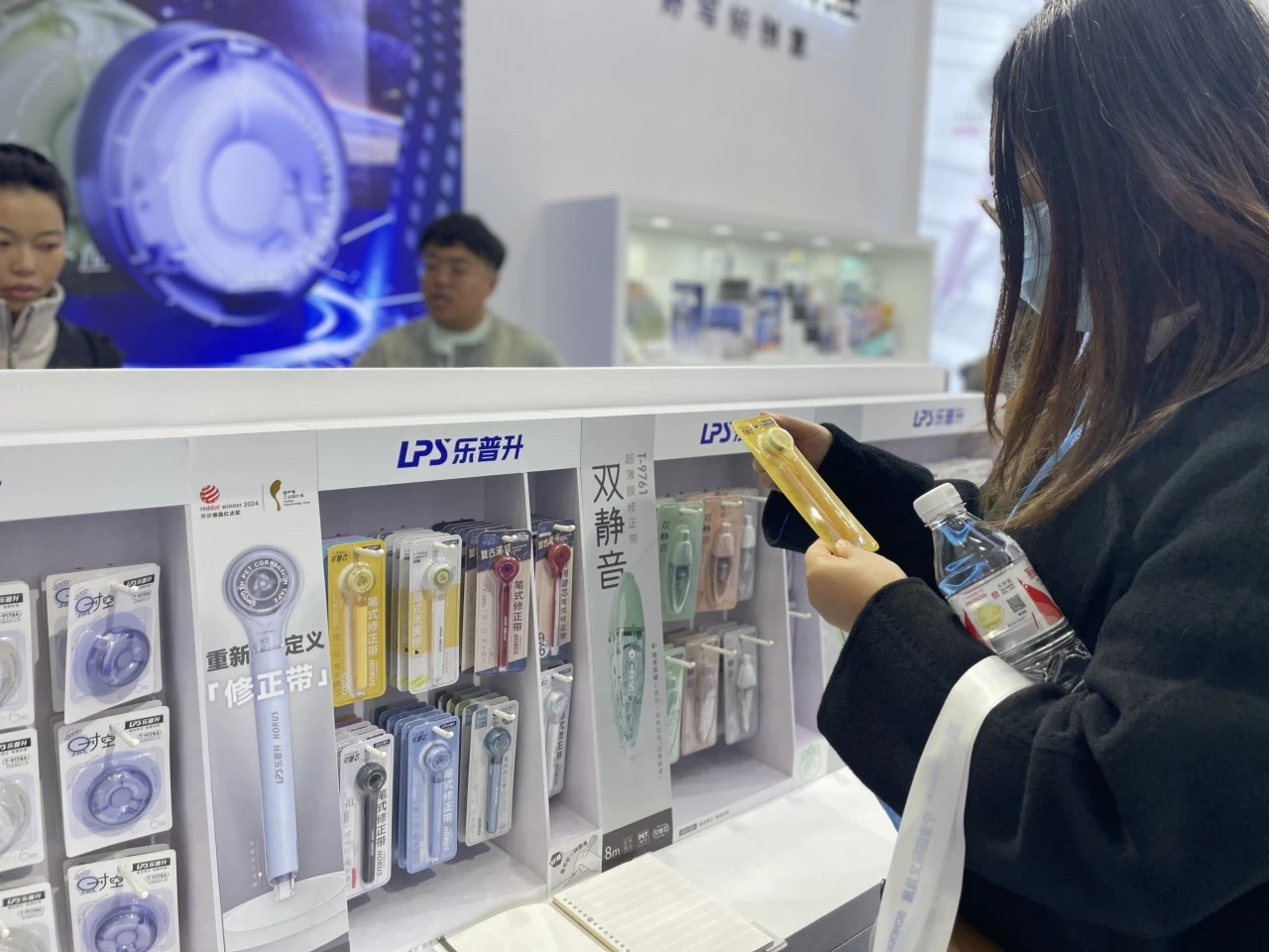 在宁波国际文具展上,乐普升展位成为众多文具爱好者和行业人士的打卡地。来自全球文具从业者纷纷在展位前驻足,对乐普升展示的创新产品表现出极大兴趣。其中明星产品9189笔式修正带,凭借其独特笔形设计和独轮卷带结构,以颠覆性创新重新定义了传统修正带,其独特的设计和卓越的使用体验,成为展会的热门焦点,吸引了大量海内外参展商前来交流并亲身体验。